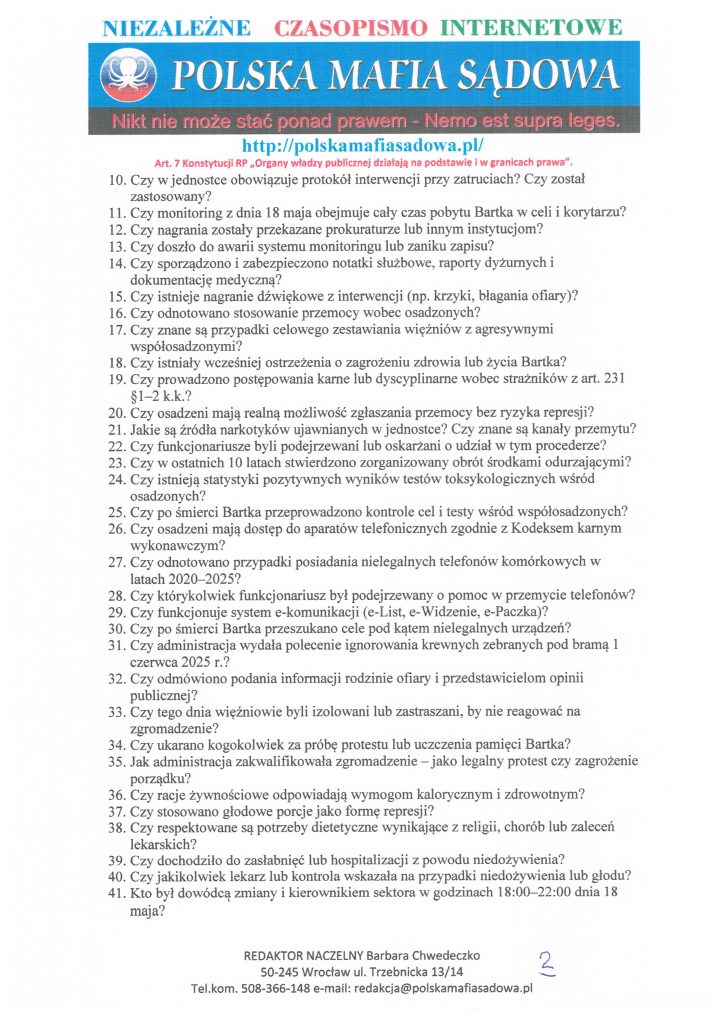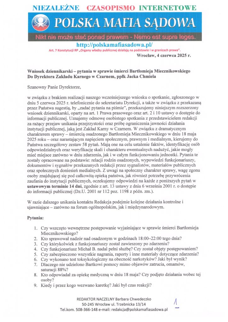 Czy śmierć Bartłomieja Miecznikowskiego była tragicznym przypadkiem, czy raczej brutalną konsekwencją systemowej znieczulicy i instytucjonalnej bezkarności? Redakcja NCI Polska Mafia Sądowa – już po pogrzebie ofiary – kieruje do Dyrektora Zakładu Karnego w Czarnem wniosek dziennikarski obejmujący 58 konkretnych, trudnych pytań. Pytania te nie są hipotetyczne – dotyczą realnych funkcjonariuszy, dokumentów, nagrań, decyzji i zaniedbań, które mogły doprowadzić do śmierci człowieka pozostającego pod pełną kontrolą państwa. Domagamy się ujawnienia prawdy – nie po to, by ją „odkrywać”, ale po to, by ją wydobyć spod warstw przemilczeń i instytucjonalnej obojętności. Bartek już został pochowany – ale prawda o jego śmierci jeszcze nie. I nie zadowolimy się milczeniem, ogólnikami ani grą na czas. To śledztwo dziennikarskie nie zostanie zamknięte, dopóki nie poznamy wszystkich faktów – i nie wskażemy winnych.
