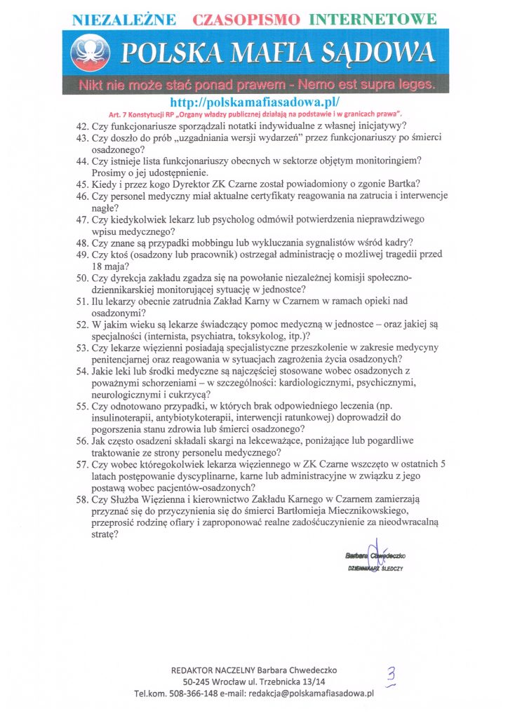 Brak odpowiedzi na postawione pytania nie zostanie uznany za milczenie administracyjne – lecz jako świadome uchylanie się od odpowiedzialności. Jeśli kierownictwo Zakładu Karnego w Czarnem oraz Służba Więzienna zrezygnują z transparentności, wówczas pytania zawarte w niniejszym wniosku staną się powszechnie zadawanym aktem publicznej odpowiedzialności – zarówno w Polsce, jak i poza jej granicami. Naszym celem nie jest konfrontacja, lecz prawda. Jednak prawda ta – jeśli nie zostanie wyjaśniona oficjalnie – zostanie ujawniona oddolnie: poprzez dokumentację, świadków, sygnalistów i determinację środowisk dziennikarskich oraz obywatelskich. Bartłomiej Miecznikowski już nie może zabrać głosu w swojej sprawie. Ale w jego imieniu – i w imieniu społeczeństwa – zrobimy to my.