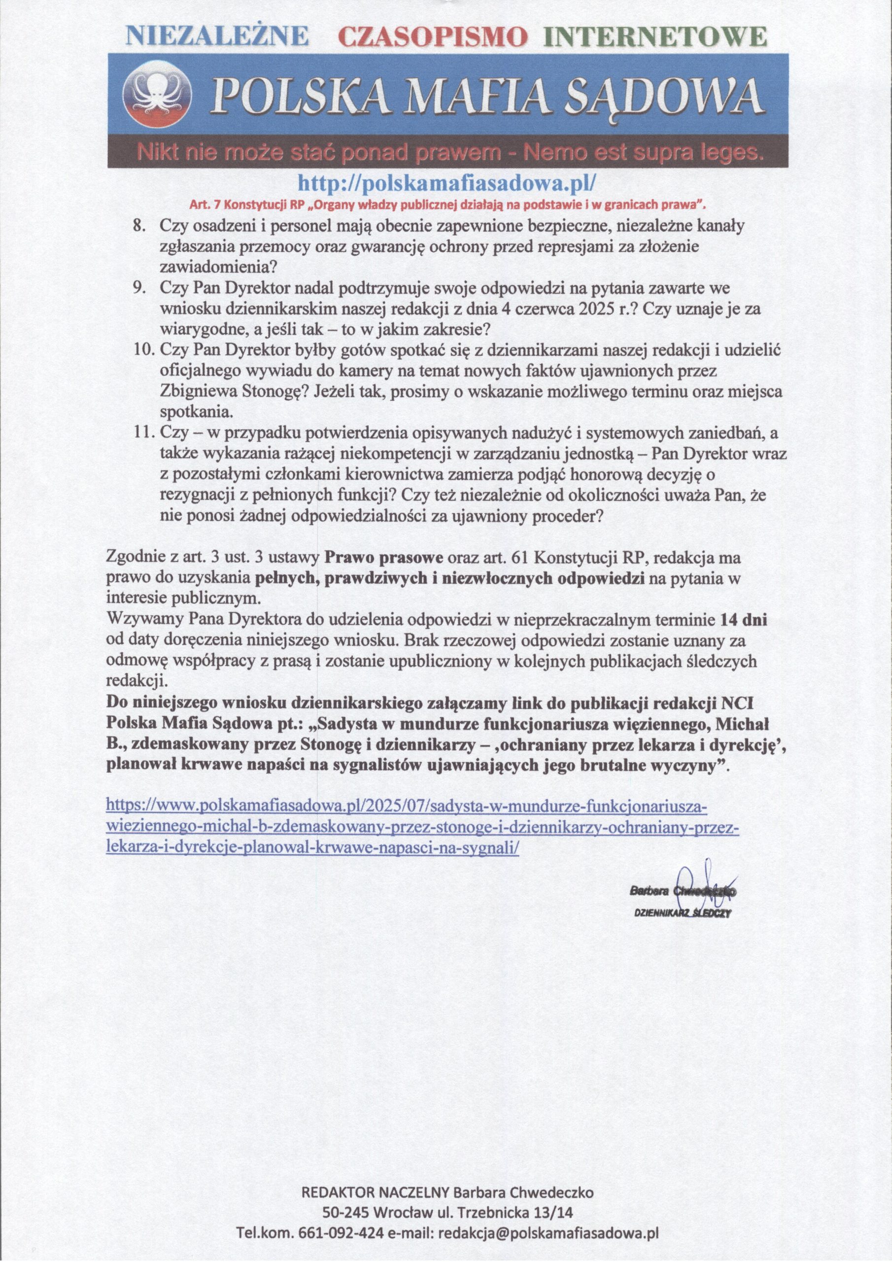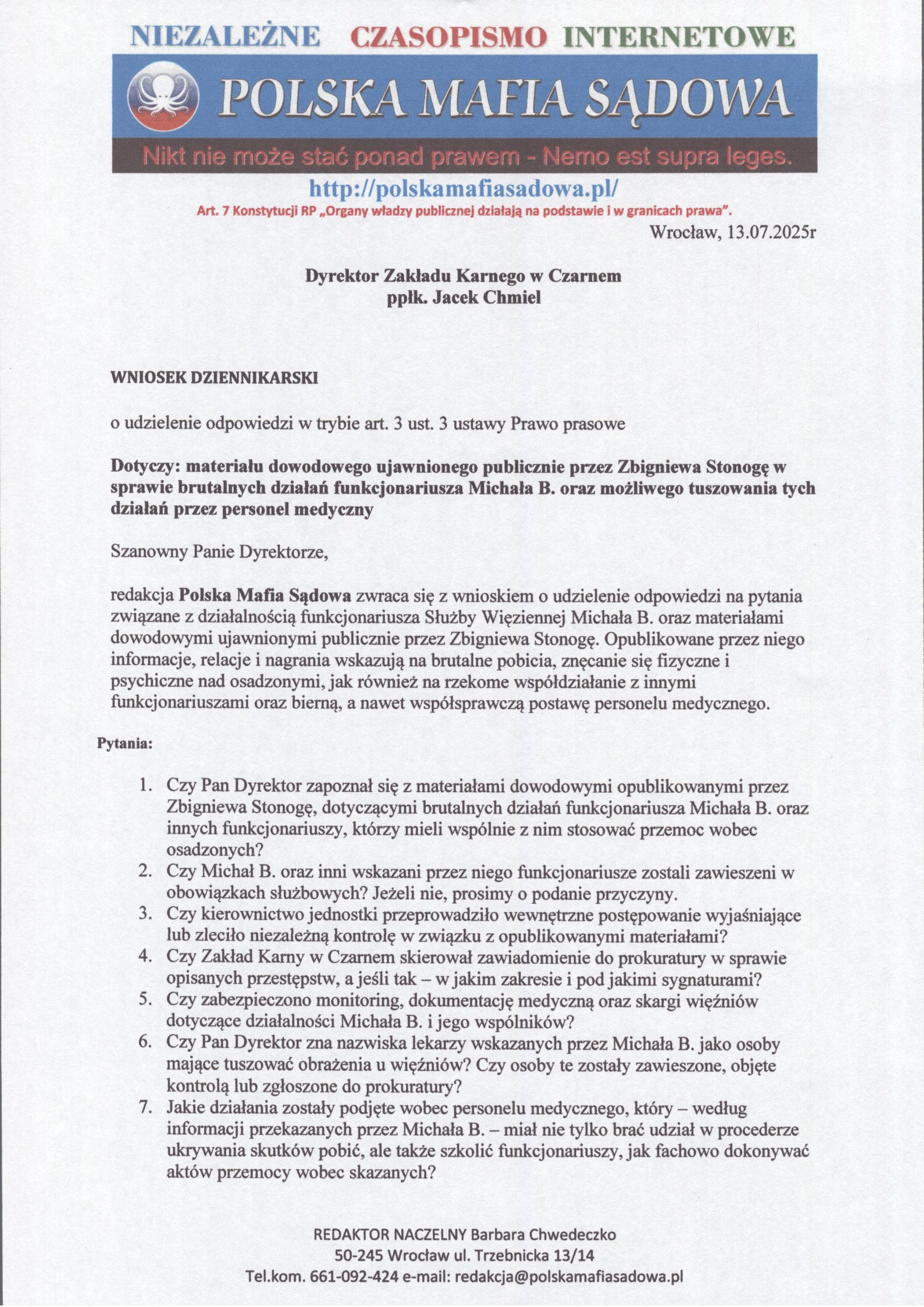 13 lipca 2025 r. redakcja NCI Polska Mafia Sądowa skierowała do ppłk. Jacka Chmiela, Dyrektora Zakładu Karnego w Czarnem, oficjalny wniosek dziennikarski w trybie art. 3 ust. 3 ustawy Prawo prasowe. Dokument dotyczy ujawnionych przez Zbigniewa Stonogę materiałów dowodowych, opisujących brutalne działania funkcjonariusza Służby Więziennej – Michała B. – i innych funkcjonariuszy wobec osadzonych, a także podejrzenia tuszowania tych nadużyć przez personel medyczny jednostki.